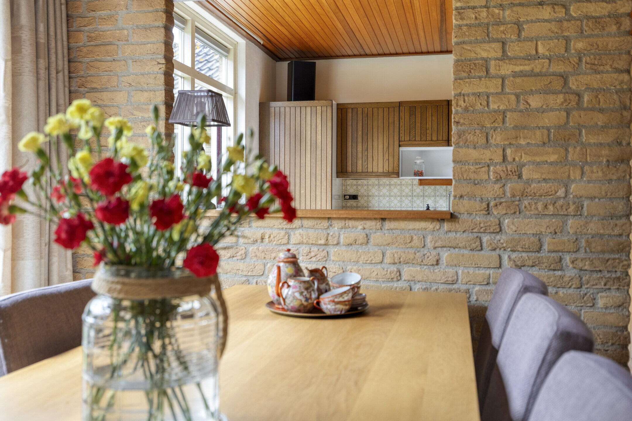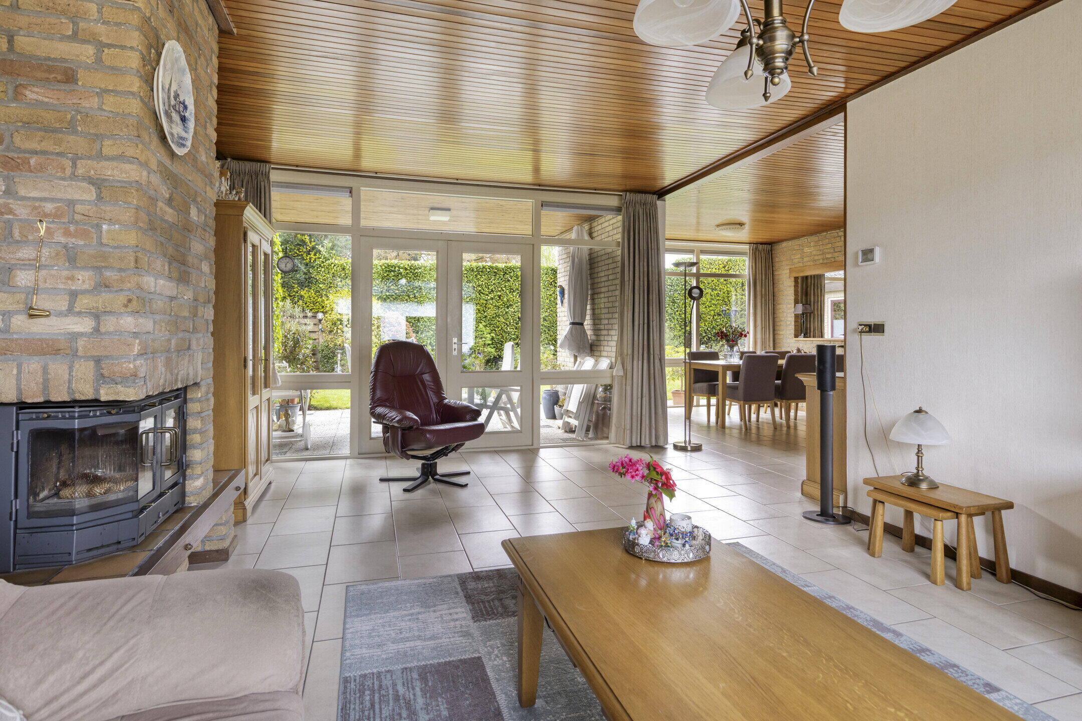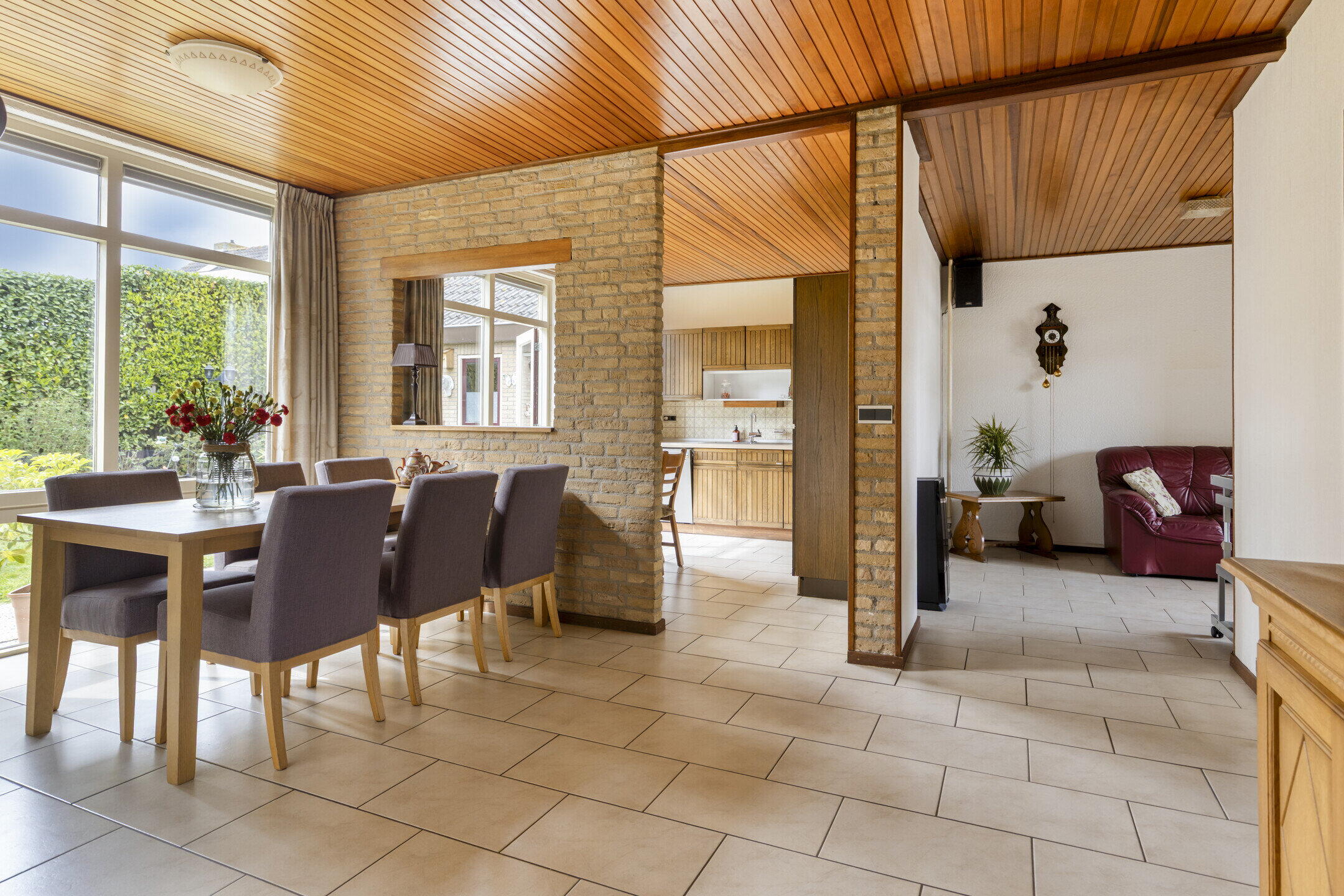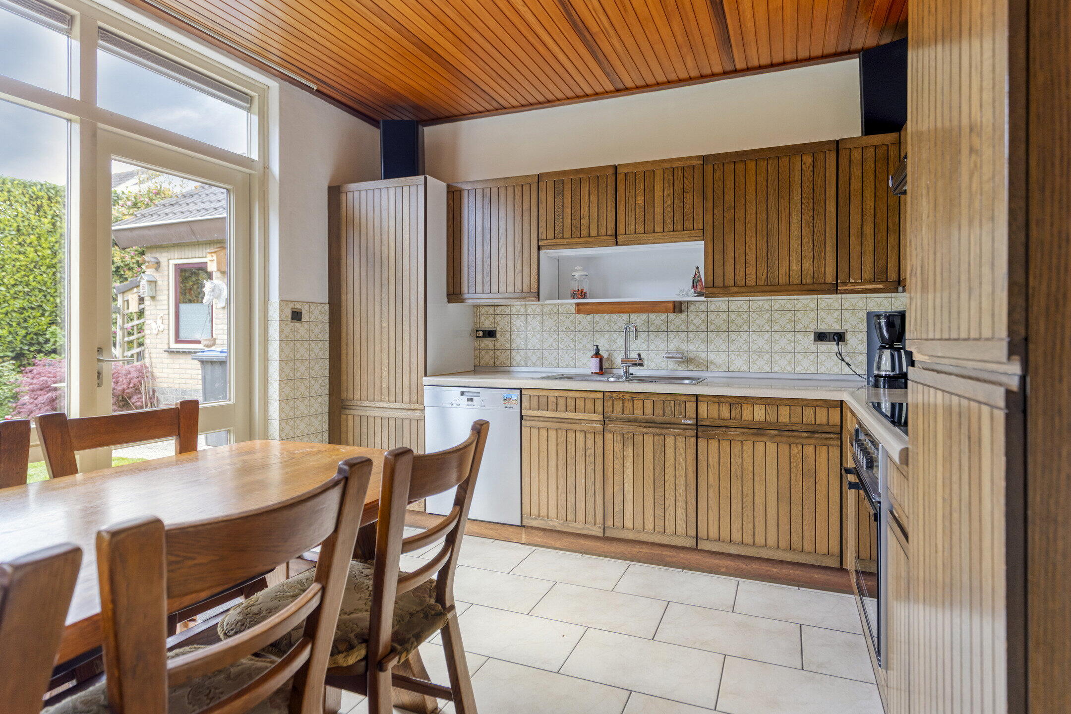 De woonkamer is speels ingedeeld in een U-vorm, wat zorgt voor meerdere gezellige zitplekken. Aan de linkerzijde bevindt zich de hoofdzithoek: een fijne plek voor een comfortabele bank en tv, compleet met houthaard voor extra sfeer. Dankzij de ramen aan de voorzijde en de tuindeur aan de achterzijde geniet je hier van veel natuurlijk licht. Aan de andere zijde van de woning is een knus tweede zitje gecreëerd, ideaal als leeshoek of rustige plek. In het hart van de ruimte bevindt zich de eethoek, met uitzicht op de tuin en wederom veel lichtinval door de grote raampartijen. De halfopen keuken staat in verbinding met de eethoek via een open doorgang en een speels doorkijkje. De keuken zelf is opgesteld in een praktische hoekopstelling en voorzien van diverse inbouwapparatuur zoals een kookplaat, afzuigkap, oven, koelkast, vriezer en vaatwasser. Er is zelfs ruimte voor een extra eettafel in de keuken.