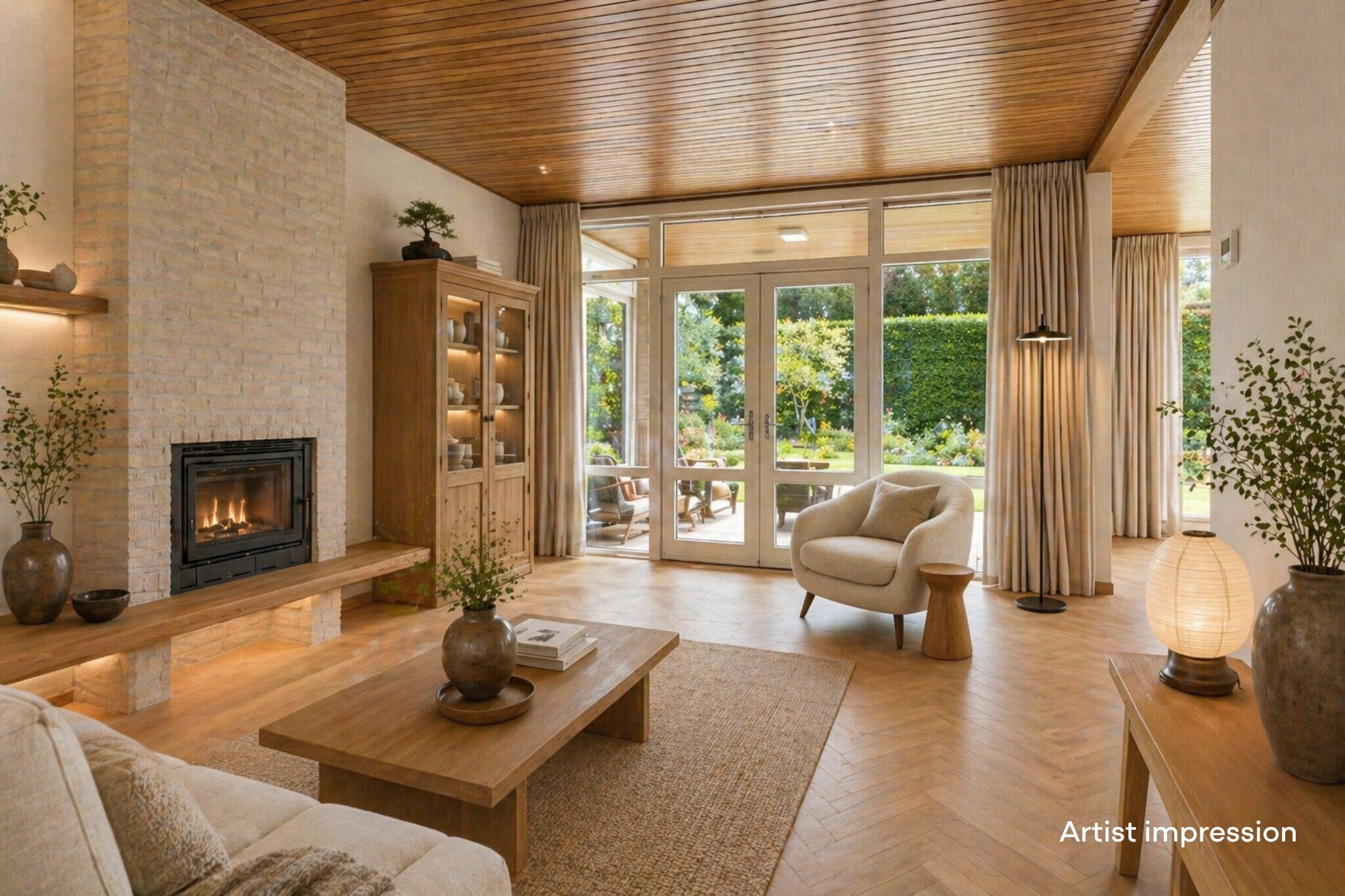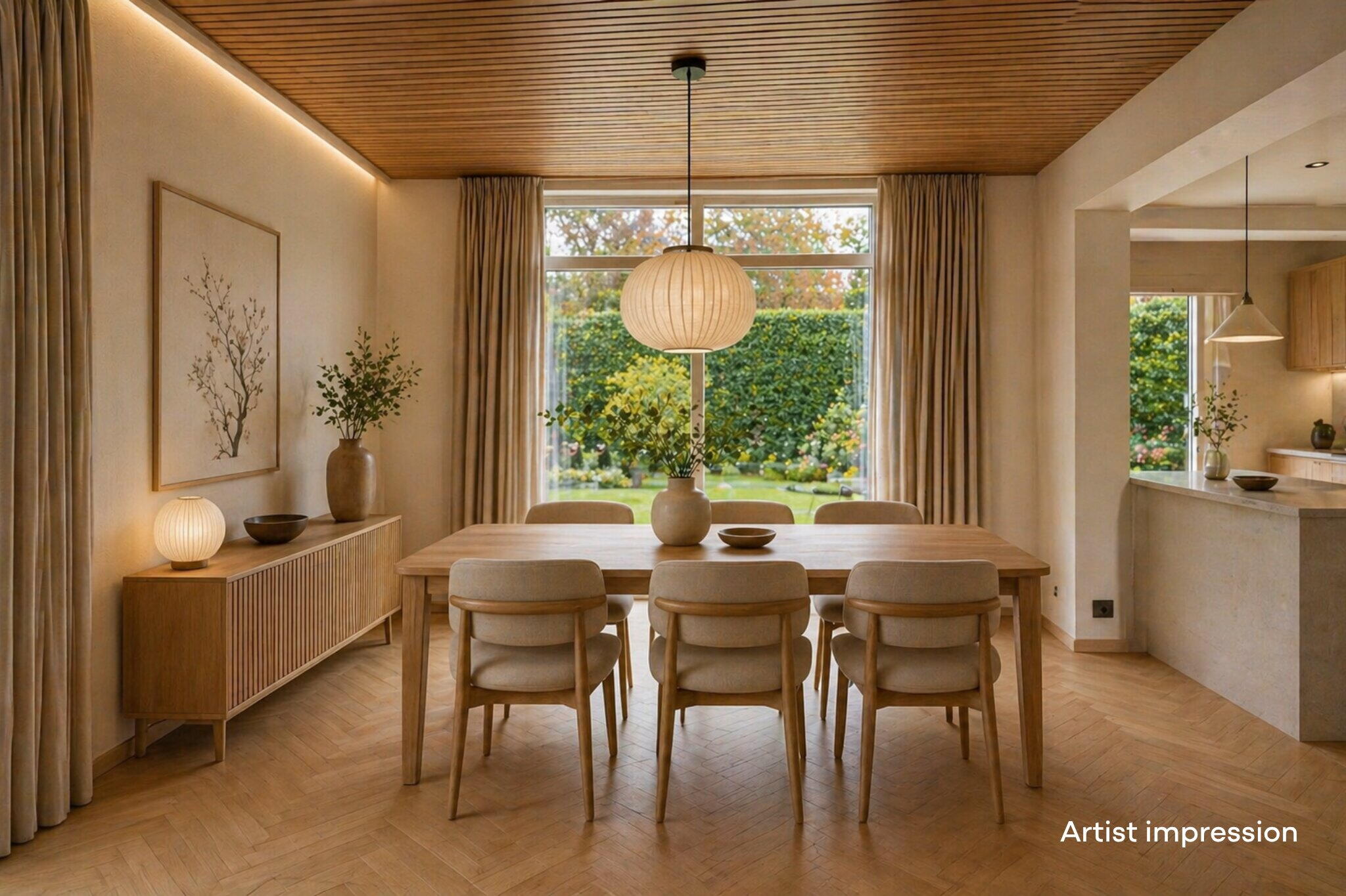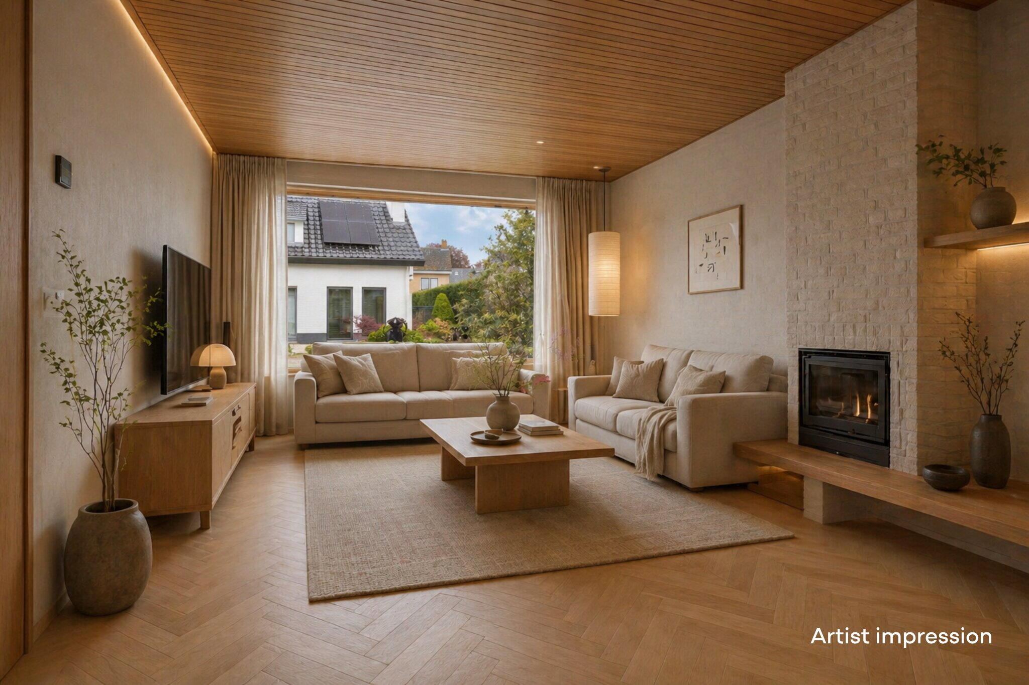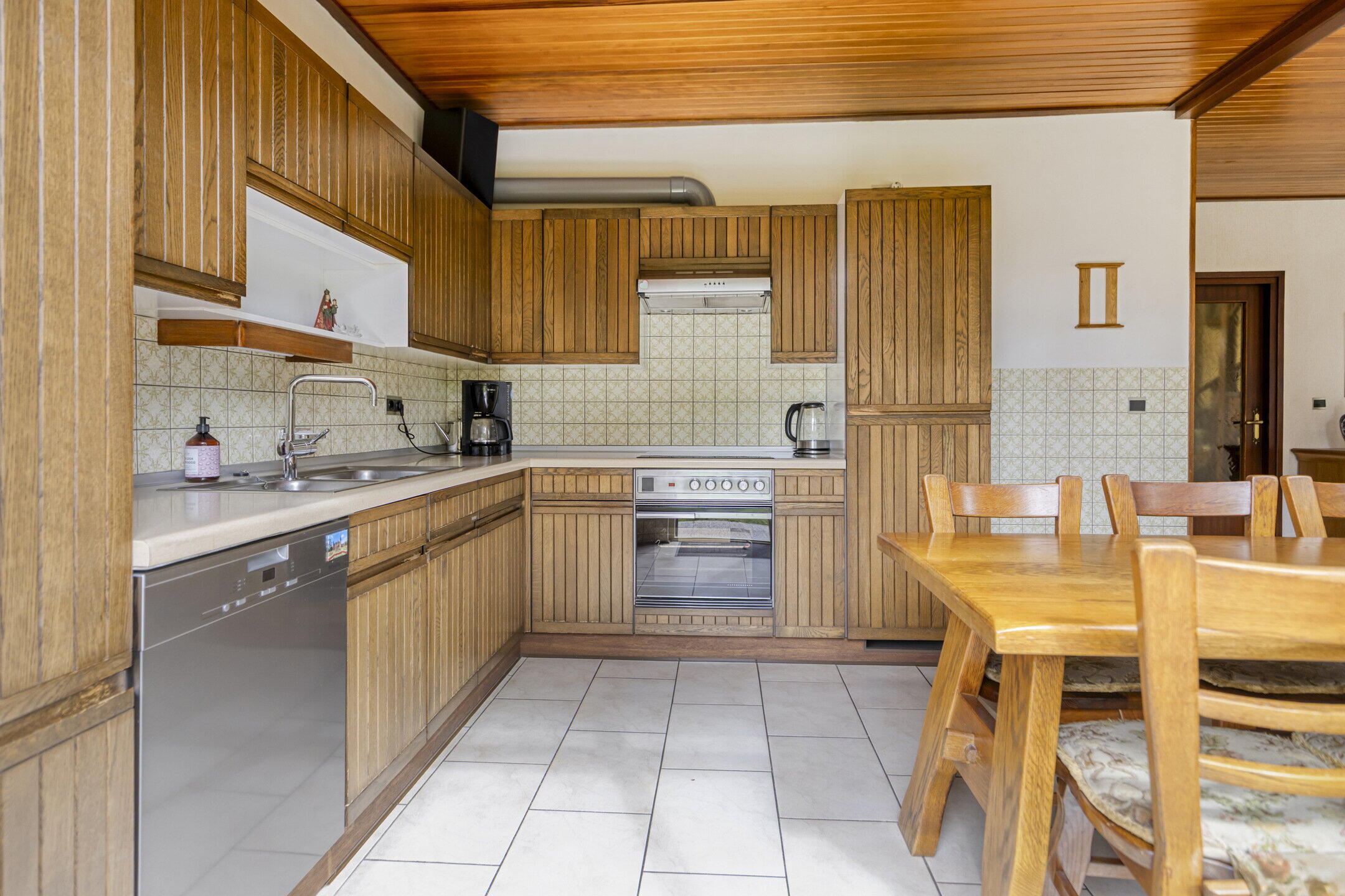 De woonkamer is speels ingedeeld in een U-vorm, wat zorgt voor meerdere gezellige zitplekken. Aan de linkerzijde bevindt zich de hoofdzithoek: een fijne plek voor een comfortabele bank en tv, compleet met houthaard voor extra sfeer. Dankzij de ramen aan de voorzijde en de tuindeur aan de achterzijde geniet je hier van veel natuurlijk licht. Aan de andere zijde van de woning is een knus tweede zitje gecreëerd, ideaal als leeshoek of rustige plek. In het hart van de ruimte bevindt zich de eethoek, met uitzicht op de tuin en wederom veel lichtinval door de grote raampartijen. De halfopen keuken staat in verbinding met de eethoek via een open doorgang en een speels doorkijkje. De keuken zelf is opgesteld in een praktische hoekopstelling en voorzien van diverse inbouwapparatuur zoals een kookplaat, afzuigkap, oven, koelkast, vriezer en vaatwasser. Er is zelfs ruimte voor een extra eettafel in de keuken.