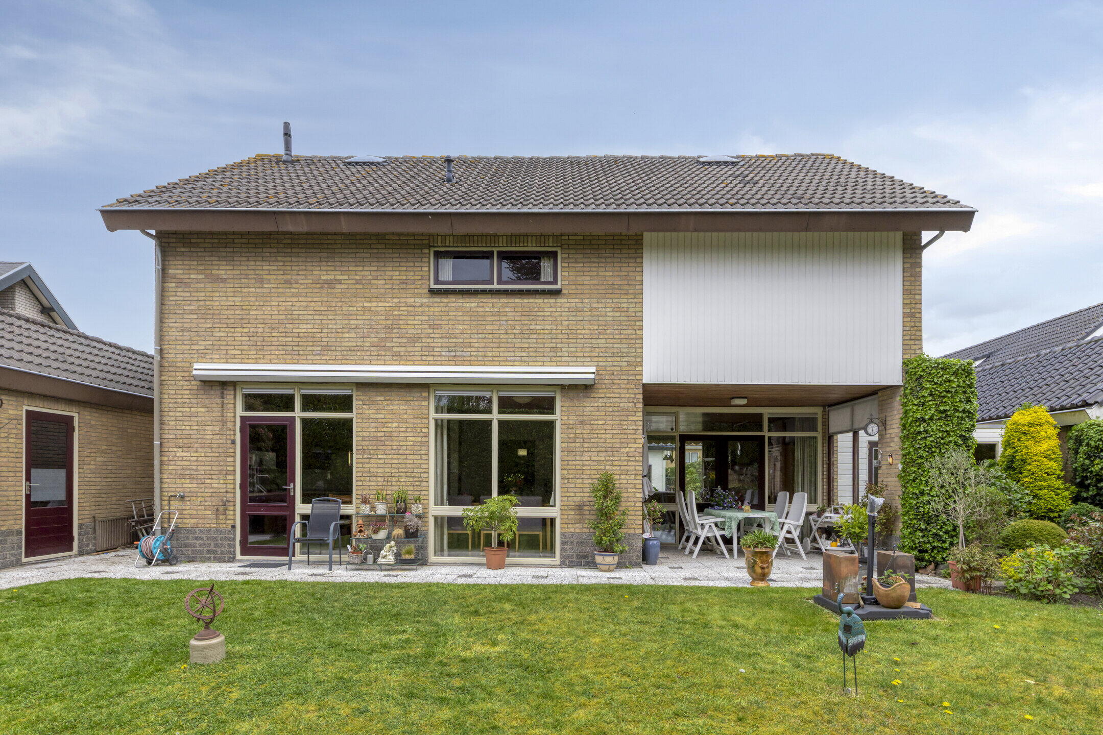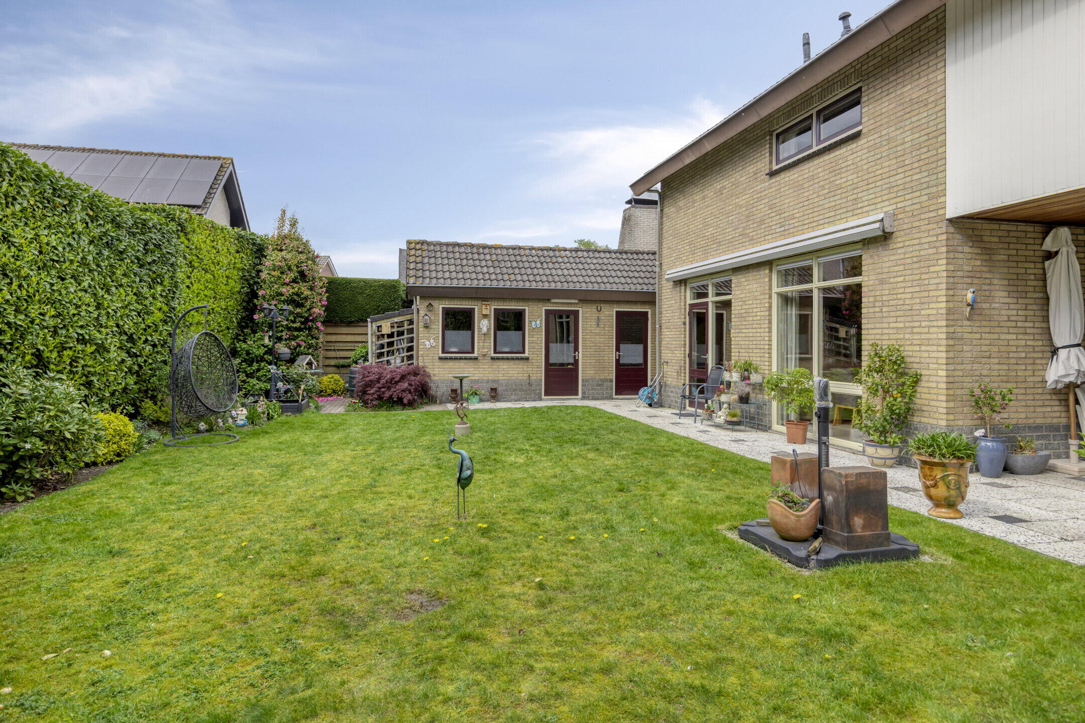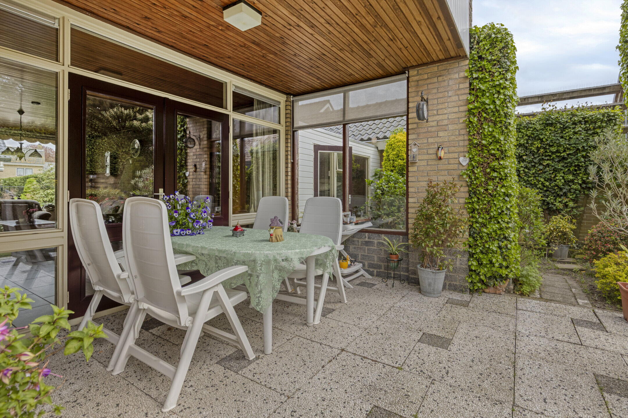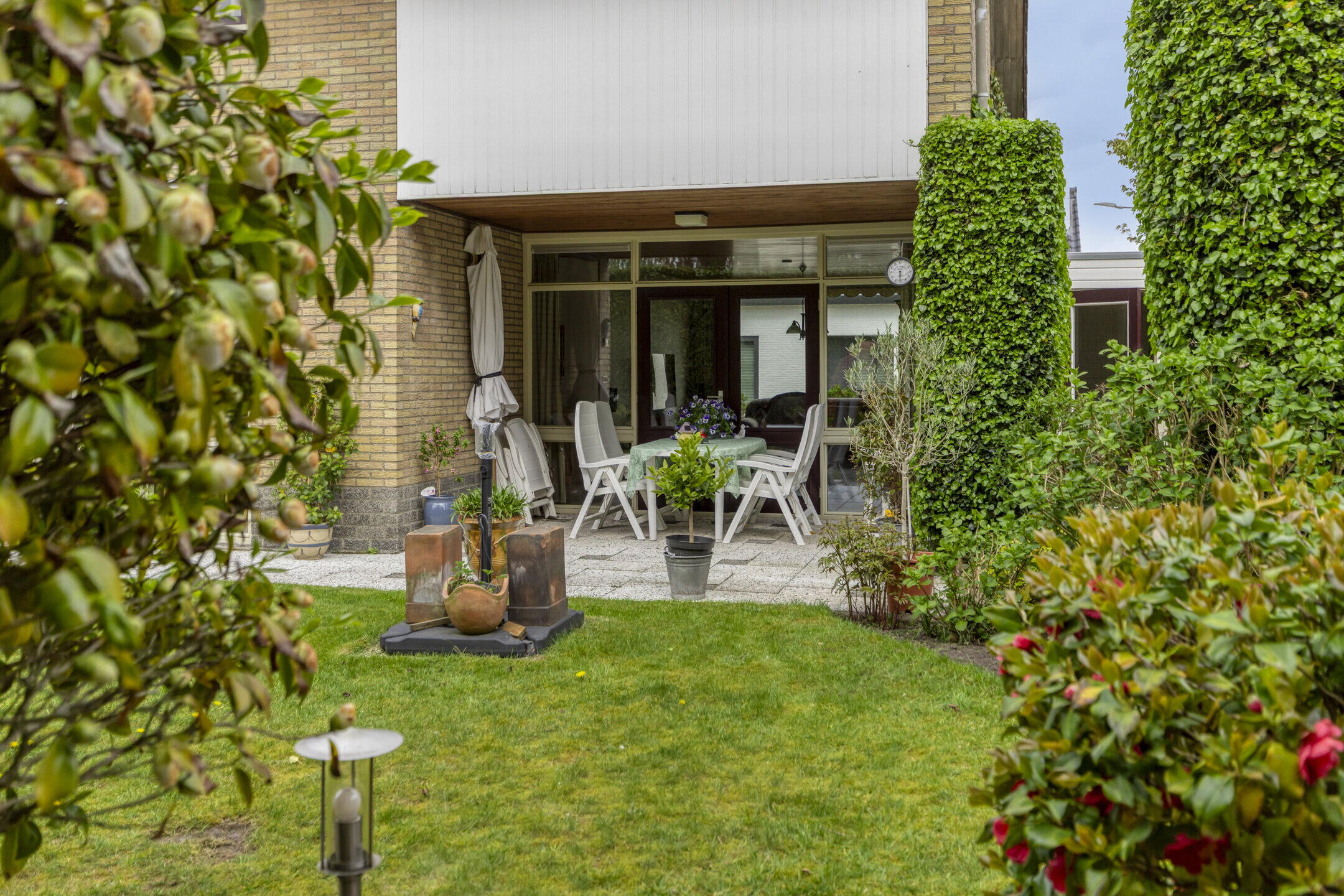 De achtertuin is een echte verrassing: ruim, groen en veelzijdig. Je bereikt de tuin via de keuken en de tuindeuren in de woonkamer, en er is ook een handige achterom aanwezig. Direct aan de woning ligt een betegeld terras met een gezellige, deels overdekte inham, ideaal voor een loungehoek of eettafel.
