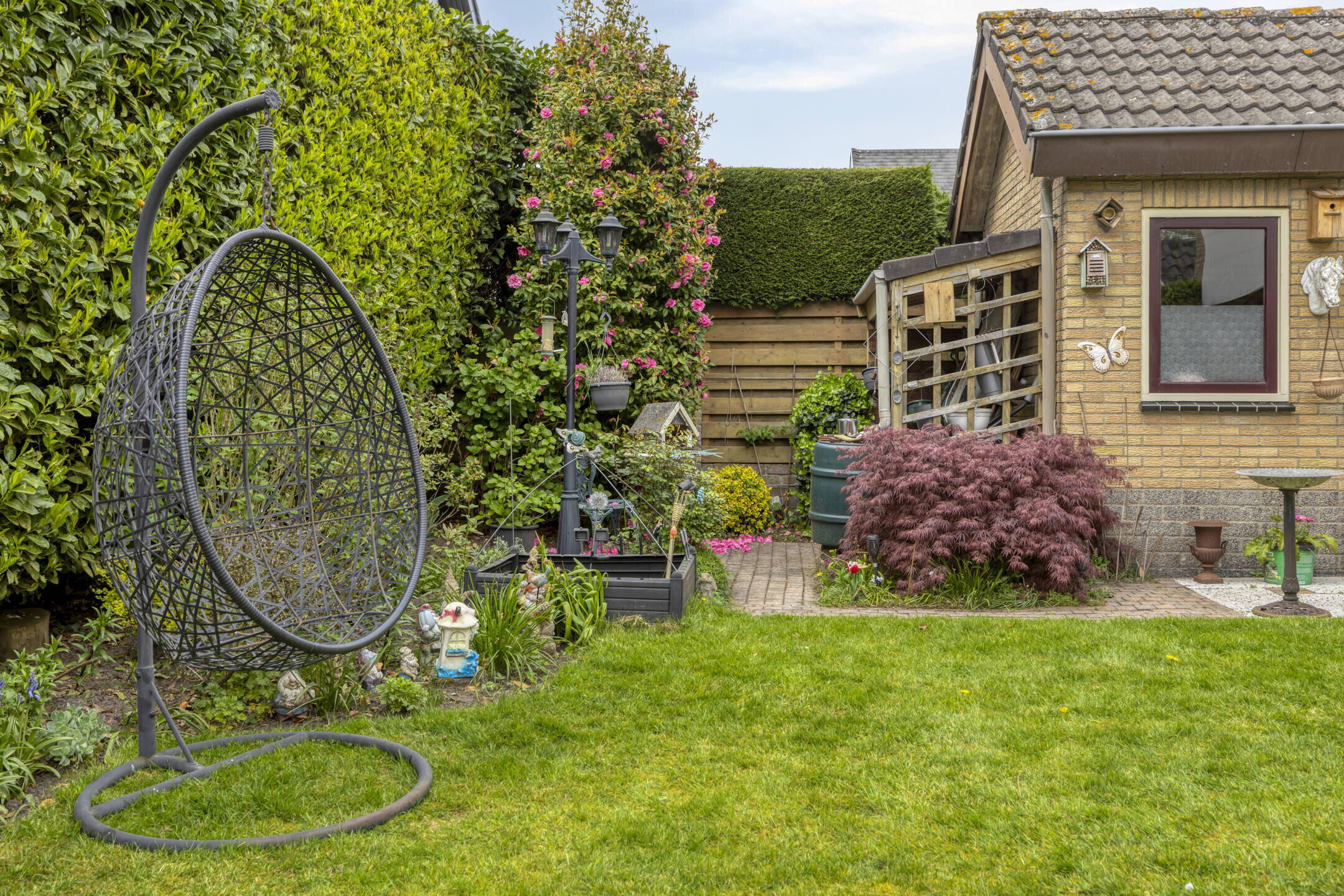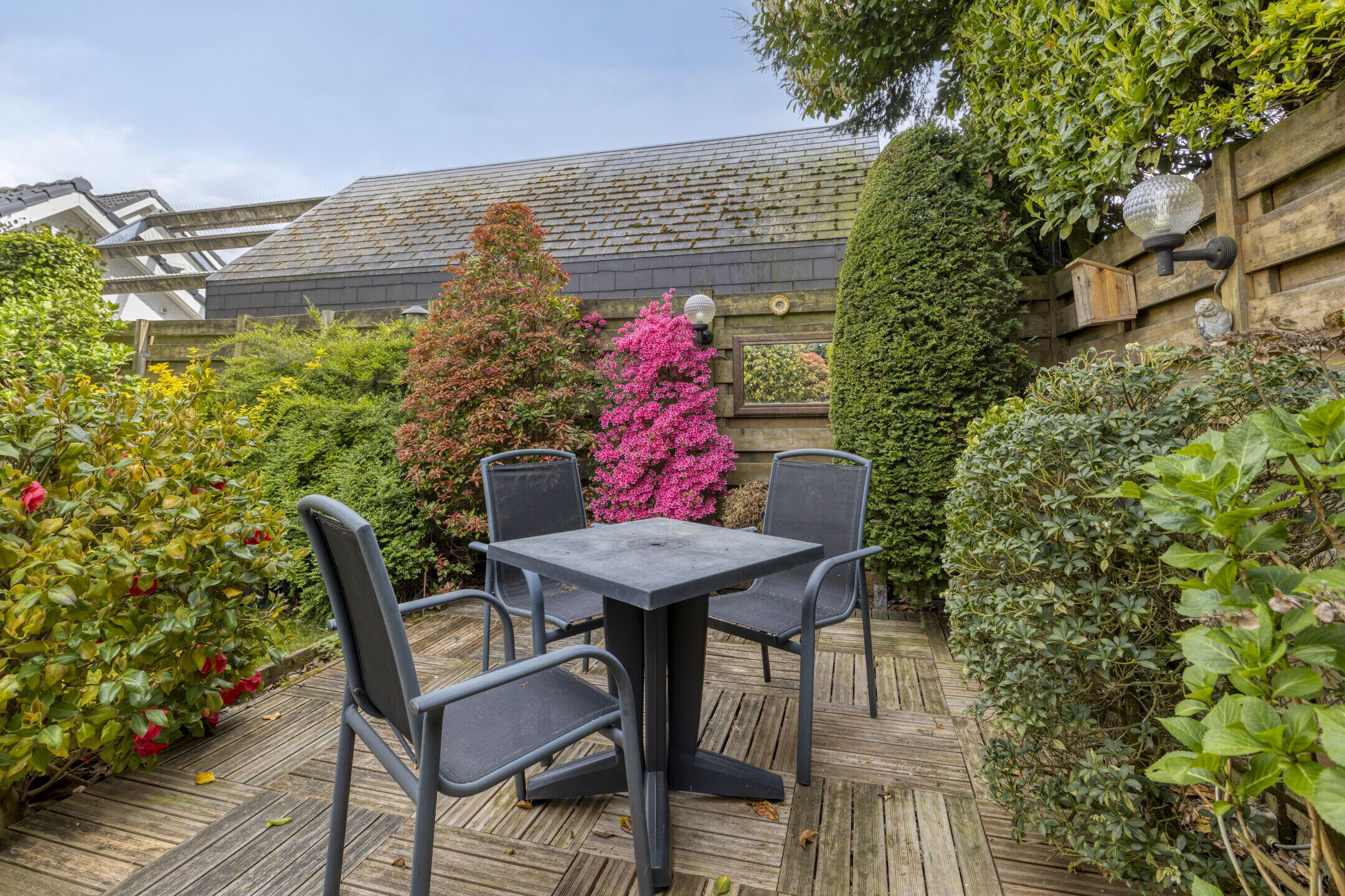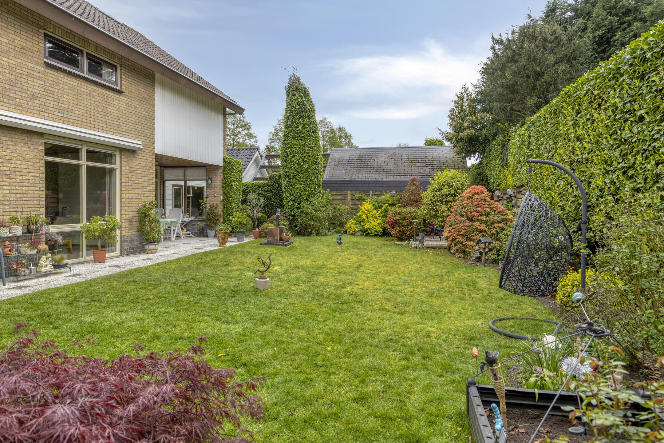 Verder vind je hier veel groen, gazon en plantenborders, én een extra houten vlonderterras. Met twee bergingen (één aan de woning en één bij de garage) heb je bovendien volop opbergruimte.
