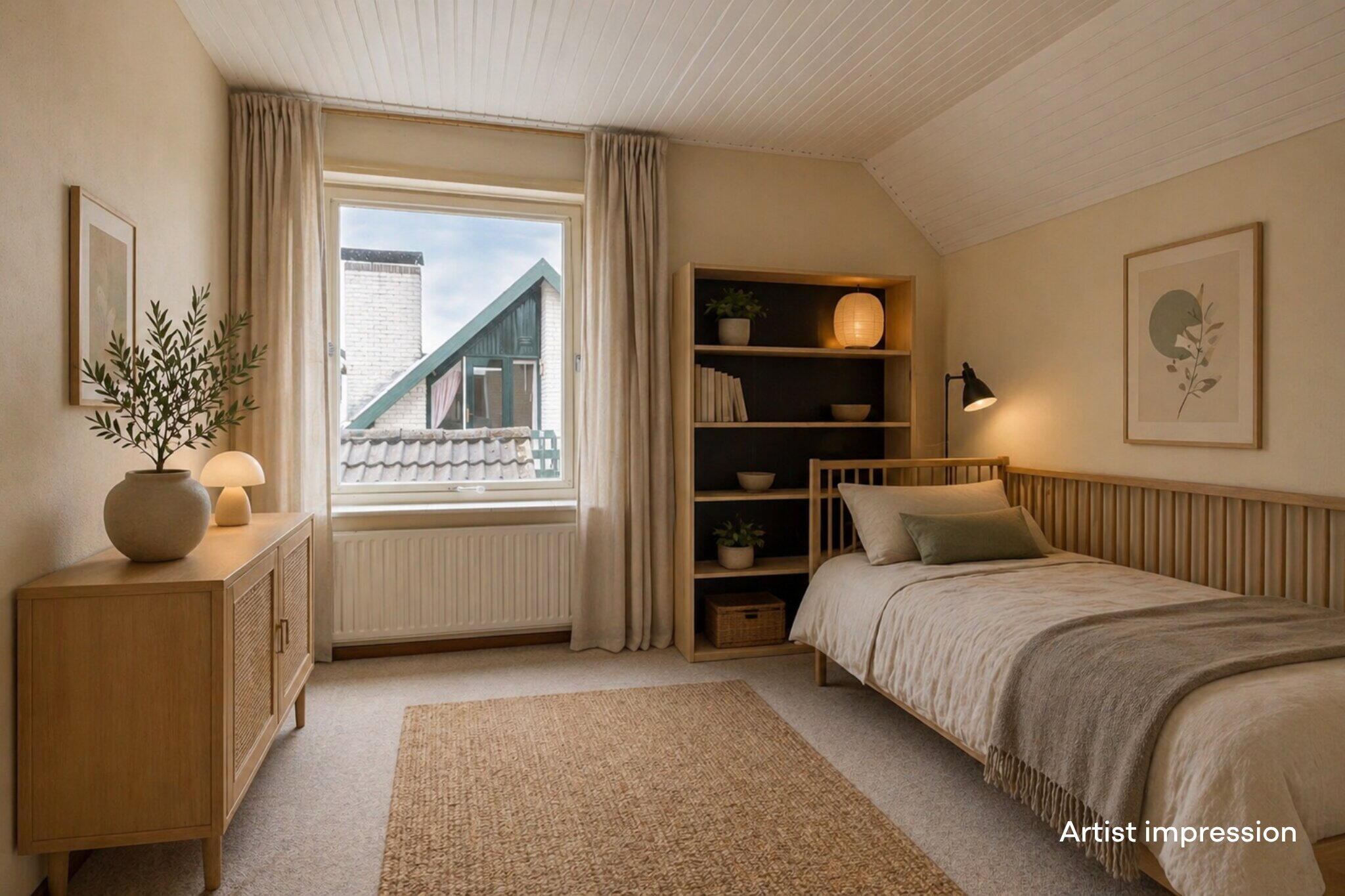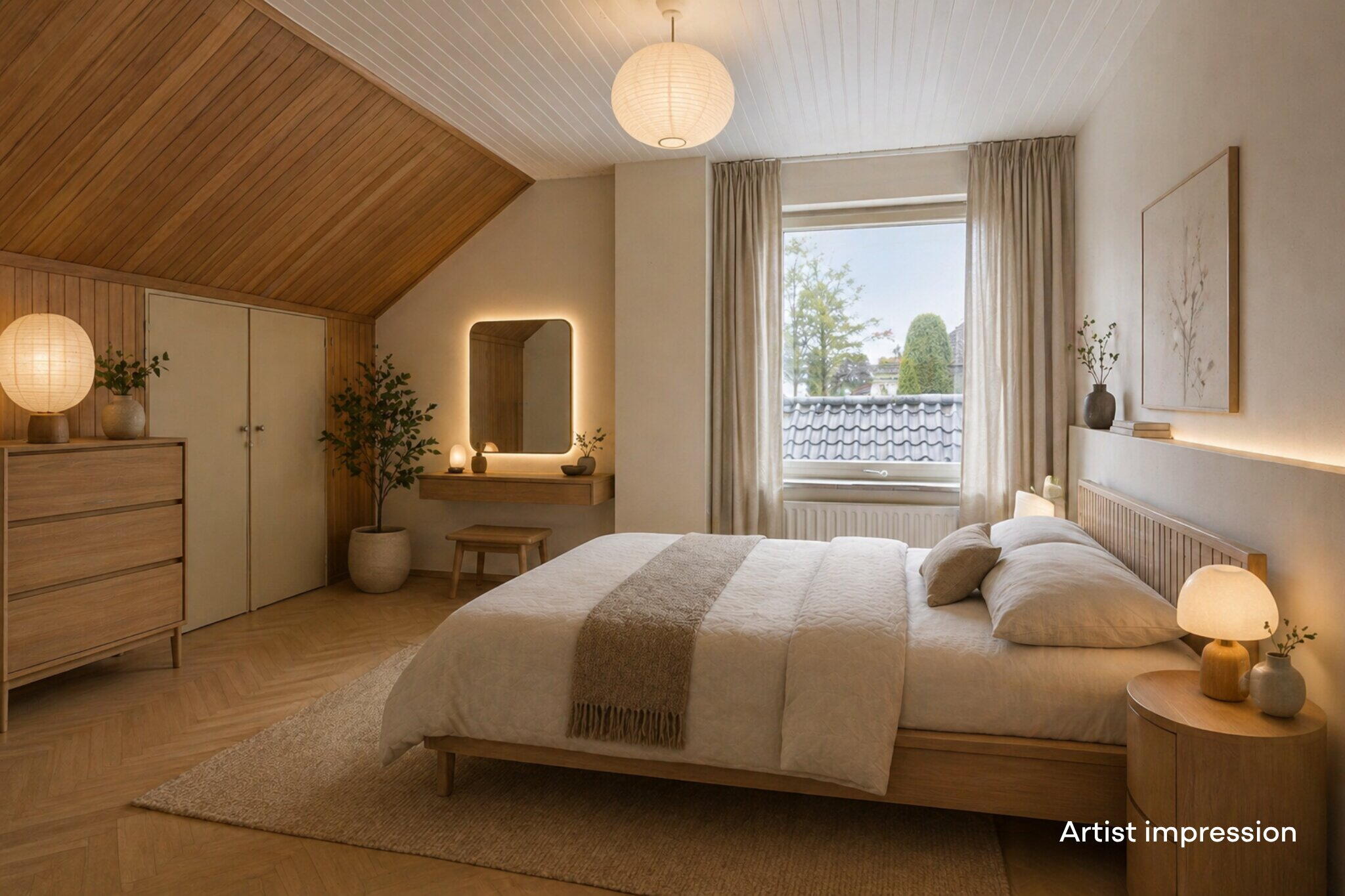 Op de eerste verdieping kom je uit op een ruime overloop met toegang tot maar liefst vier volwaardige slaapkamers. Alle kamers zijn ruim opgezet en voorzien van een eigen wastafel, ideaal voor gezinnen of gasten. De master bedroom beschikt daarnaast over een praktische bergruimte onder het schuine dak.
